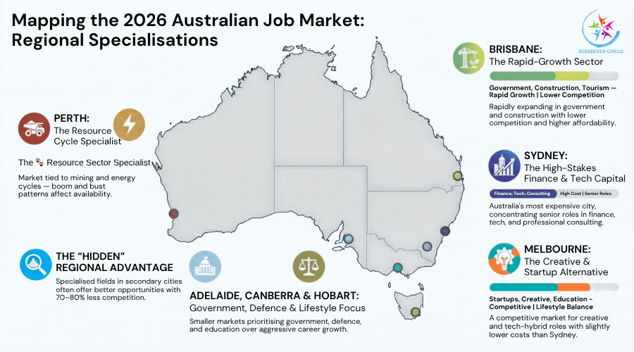 Strategic insight: Don’t just chase Sydney/Melbourne because they’re the biggest cities. If you’re in a specialized field (resources, government, education), secondary cities might offer better opportunities with less competition.